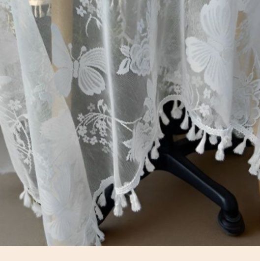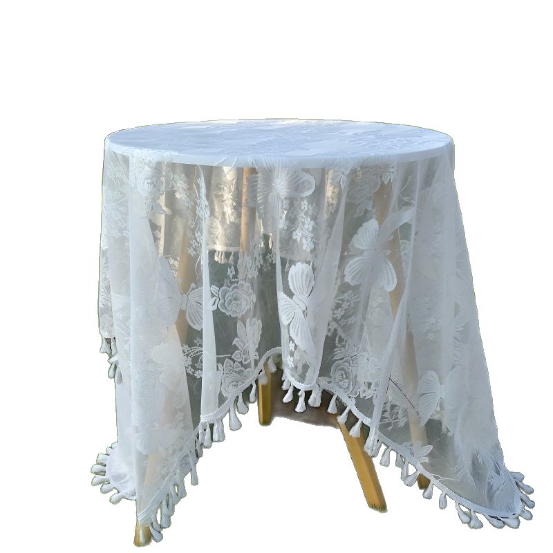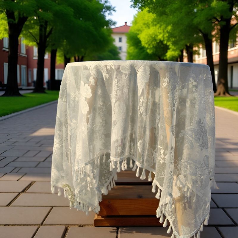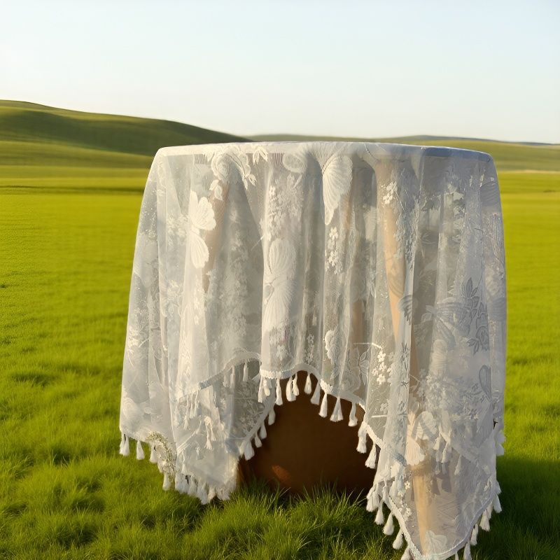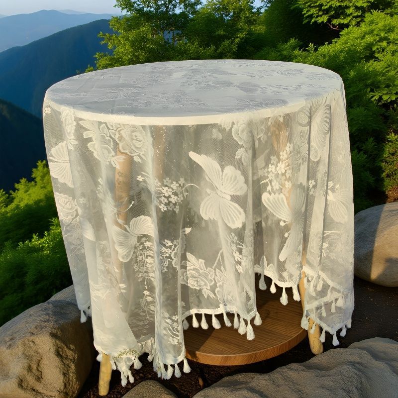 繊細な蝶々と花の模様が全面に施された透け感のある総レース仕様のテーブルクロス用布です。 裾には可愛らしい房飾りが付いており、優雅で上品な雰囲気を演出します。 薄手で軽やかな布地は、テーブル全体を柔らかく包み込み、お部屋に華やかさをもたらします。 フォーマルなおもてなしの席から日常使いまで幅広くお使いいただけるテーブルクロスです。