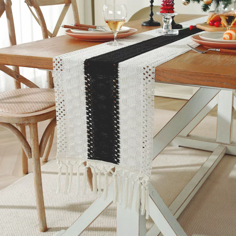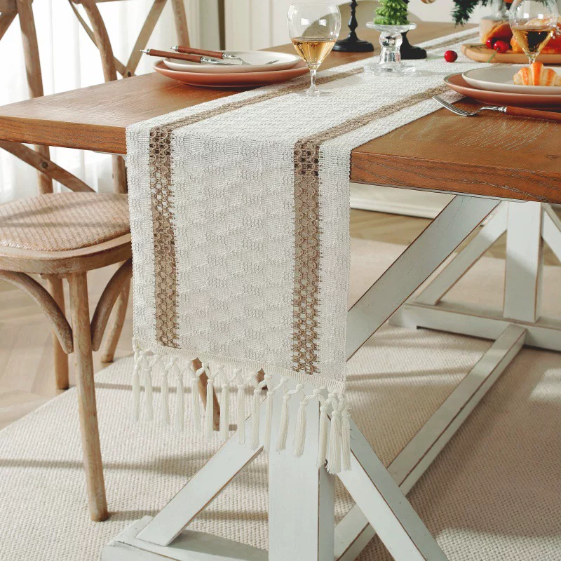 食卓に温かみと上品さを演出するセンタークロスです。 淡色と落ち着いた色調の縞模様が織りなす優しい雰囲気が特徴で、テーブルクロスとの相性も抜群です。 両端には繊細なレース編みと長めのフリンジをあしらい、ナチュラルで洗練された印象を与えます。 日常使いから来客時まで、様々なシーンで食卓を華やかに彩ります。