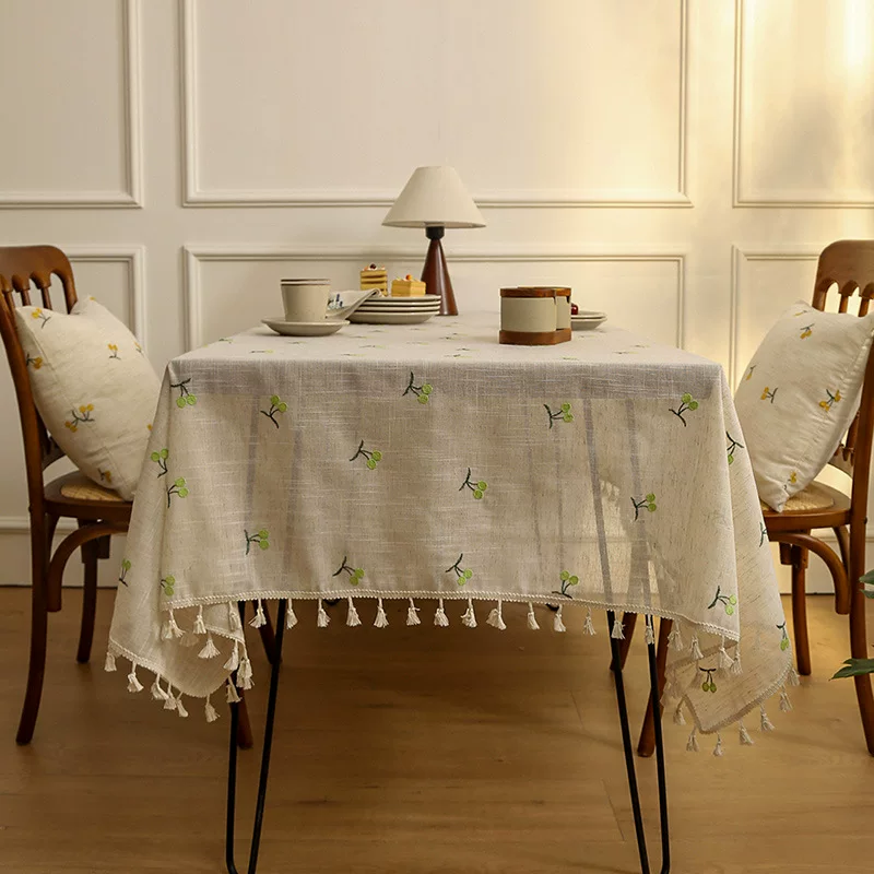 小さなフルーツの刺繍が全面に散りばめられた、ナチュラルな風合いのリネン素材のテーブルクロスです。