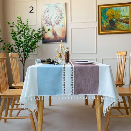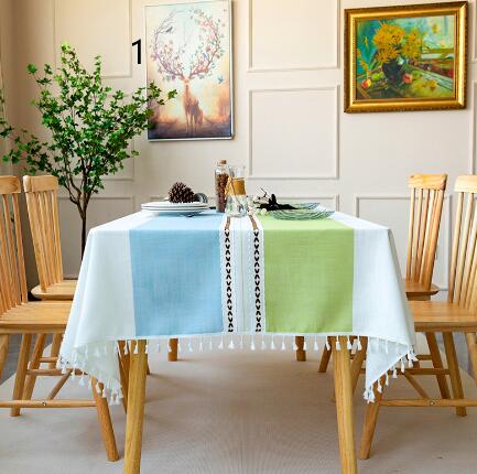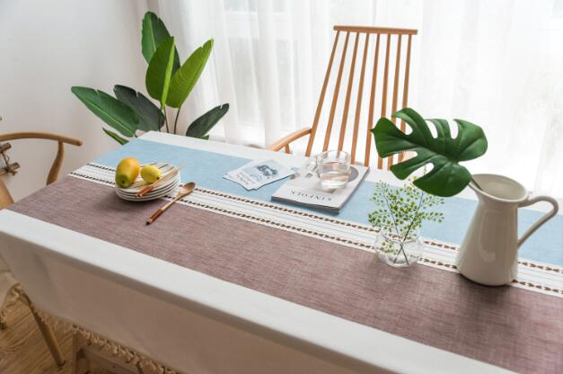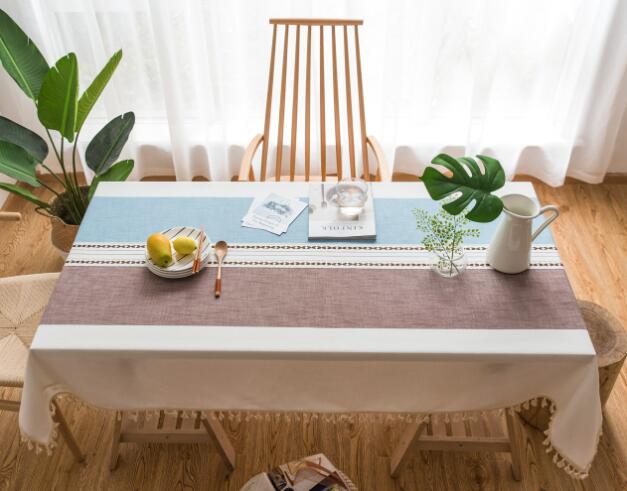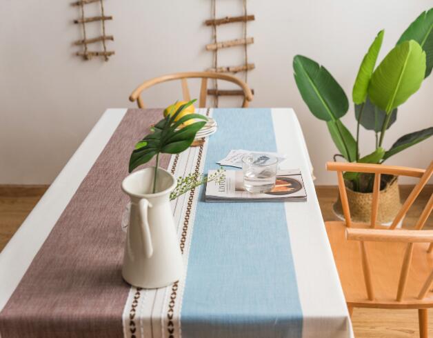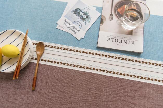 爽やかなブルーとブラウンの配色が美しい布製テーブルクロス。