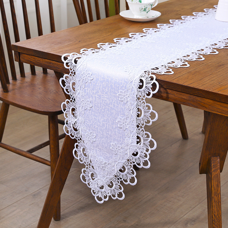 繊細な花刺繍と優雅なレース縁取りが特徴的なセンタークロスです。