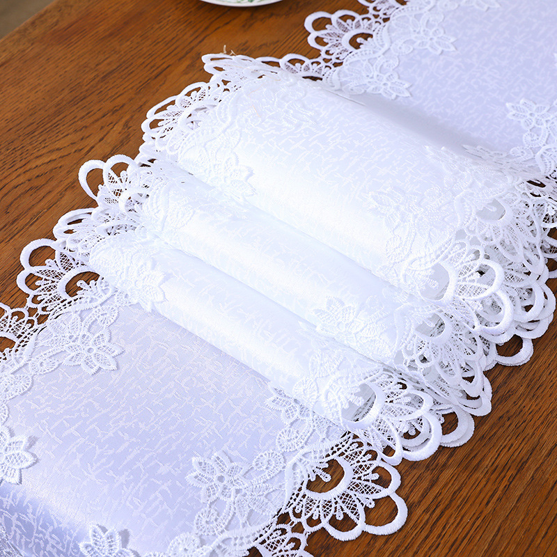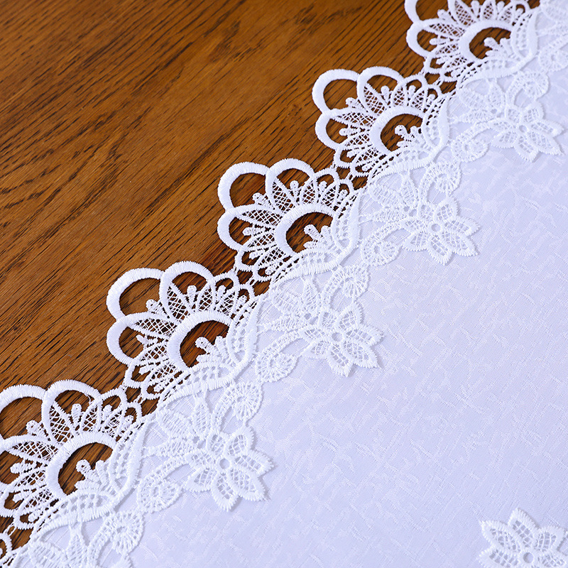 縁の連続した円形レースが華やかさを演出し、テーブルを上品に彩ります。
