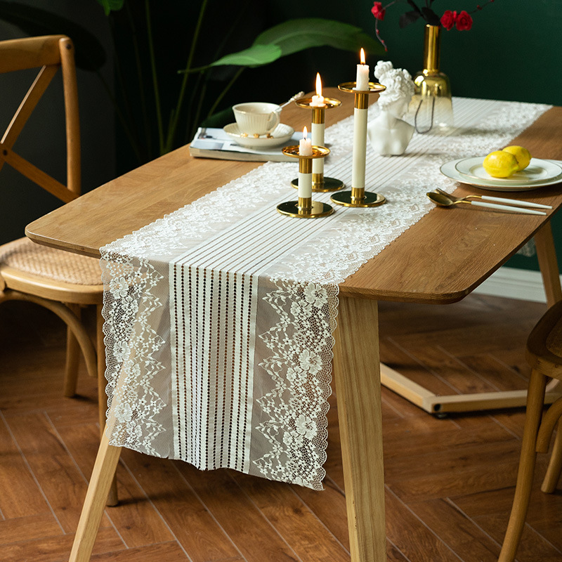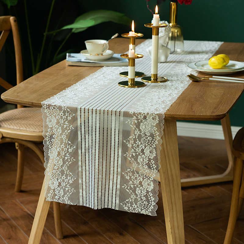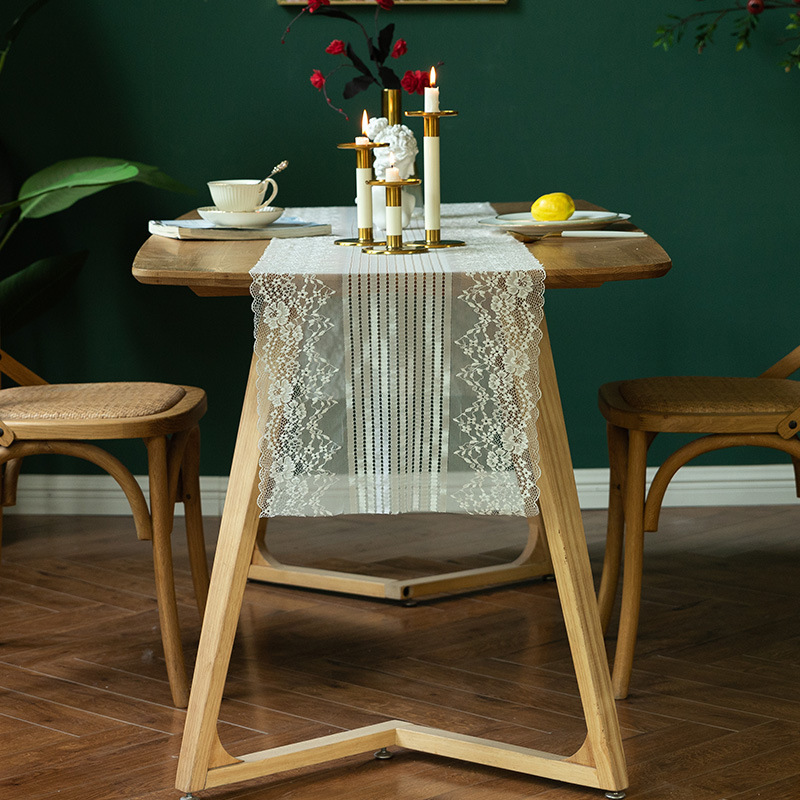 両端に施された繊細なレース装飾が美しいセンタークロスです。